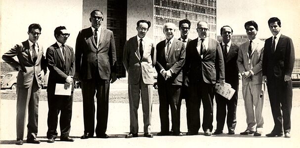 Tendo ao fundo os edificios do Congresso Nacional e fazendo pose para a posteridade, da esquerda para a direita: Adaucto Nobrega (SC), Joao Henrique Serra Azul (DF), Alberto Teofilo (PE), Flavio de Carvalho Jr (SP), o legendario Joao de Souza Mendes (GB), 7 vezes campeao nacional, Antonio Carlos Osorio (arbitro do torneio), Jose Thiago Mangini (GB), Sergio Farias (GB), Helder Camara (GB) e Antonio Rocha (DF). Rocha venceu o torneio, com ½ ponto de vantagem sobre Helder. Estao todos de terno e gravata porque tinham acabado de visitar o Palacio do Planalto, onde foram recebidos pelo Presidente da Republica, o Marechal Humberto de Alencar Castello Branco. |