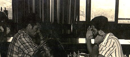 20° Jogos Abertos de Santa Catarina, Blumenau, 23 de outubro de 1979 : a 4ª rodada em andamento. Em primeiro plano, Francisco Franca (Florianopolis) enfrenta Alfredo Tomazoni (Balneario Camboriu). Franca venceu esta partida contribuindo para a vitoria de Florianopolis por 2 a 1 (veja detalhe abaixo).