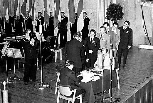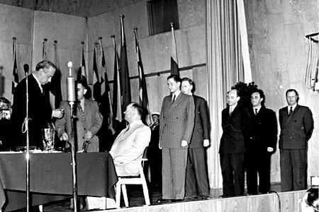 Helsinki, 09 de agosto de 1952 : Cerimonia inaugural da 10ª Olimpiada com a apresentacao oficial e inscricao |
