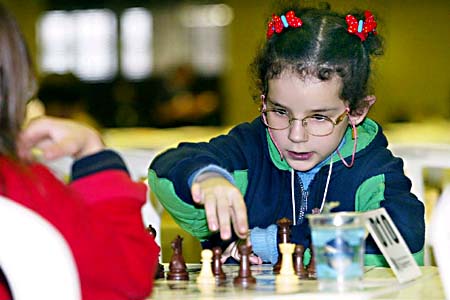 A pequena enxadrista mostra determinacao : ela sabe exatamente o que fazer com esta torre. |