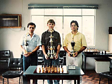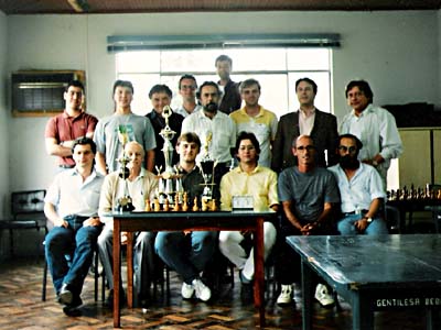 Jogadores e membros da organizacao posam para a ultima foto. Sentados: Edison Marques (Blumenau), Aldo Prada (Jaragua), Charles Gauche (Blumenau), Milton Braitt (Florianopolis), Jose' Manuel Nunes (arbitro geral), Raul Arruda Filho (Lages). De pe': Dalton Lueders (responsavel pelo boletim), Volmir Lupato (Concordia), Ricardo Feldens (Jaragua), Walter Sonnenhol (organizador), Wladimir Pereira Neto (Florianopolis), Jorge Godois (Maravilha), Edward Gauche (Blumenau), Martim Afonso de Haro (Florianopolis) e Marcos Lucht (diretor geral)... |
